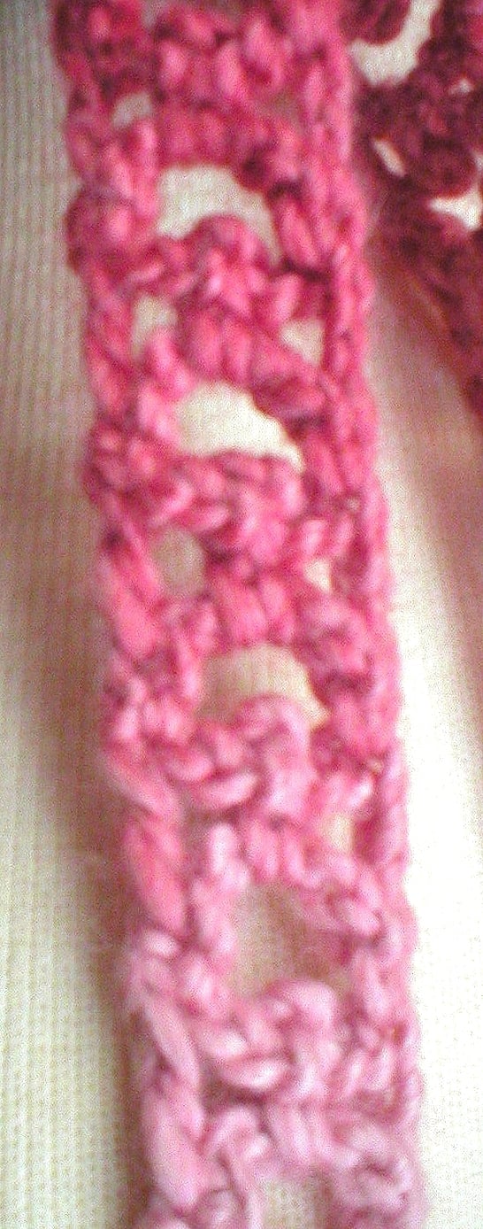 The flower embellishment and picot mesh strap are crocheted in Patons Soy Wool Stripes, a wool and bamboo blend yarn. The long color lengths within this striping yarn create a subtle movement from one color to the next.