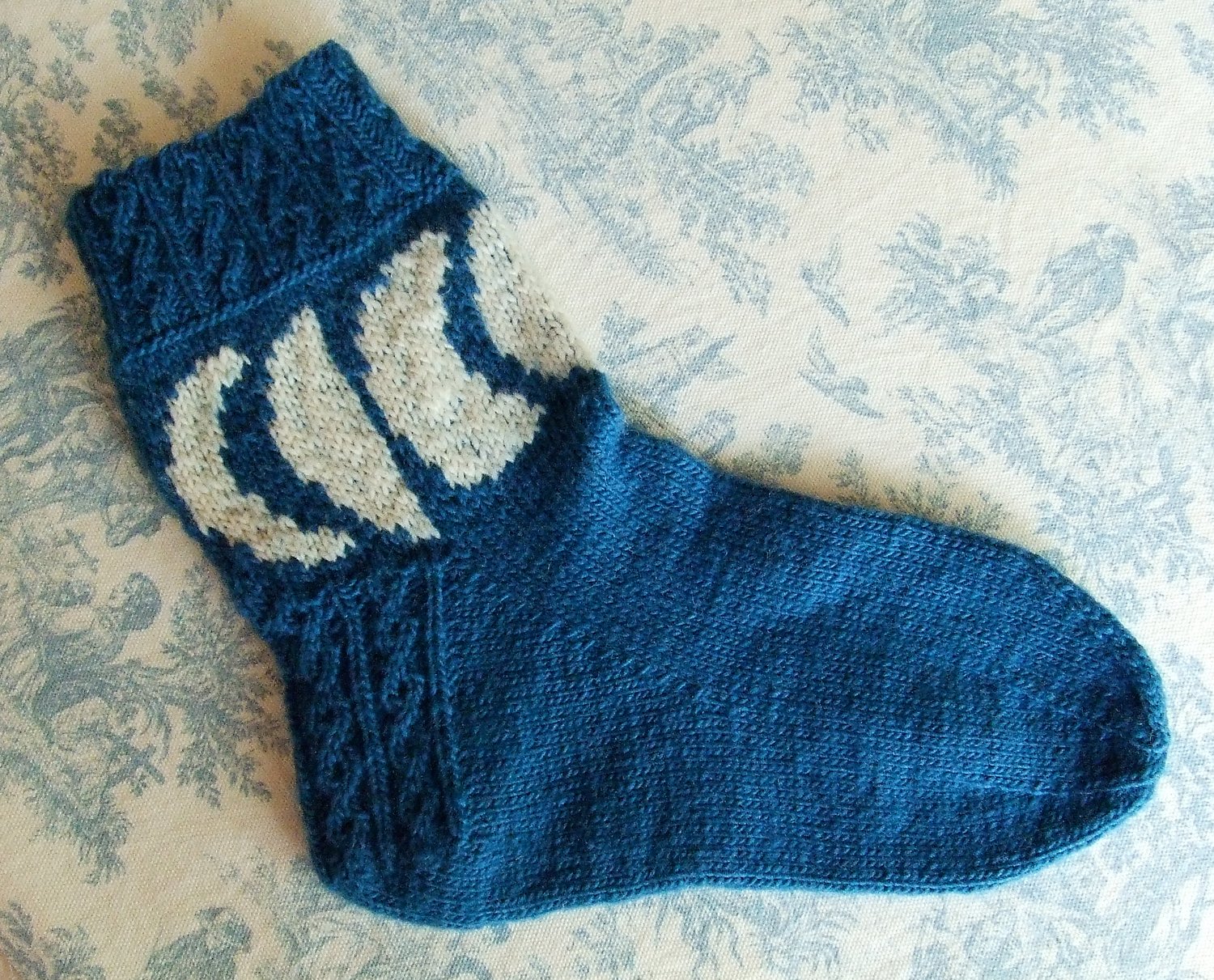 Though the garment is long gone, I revived the idea, in a more wearable garment. I re-scaled the chart, and created one repeat around the leg of a sock – plenty of moons for anyone!