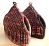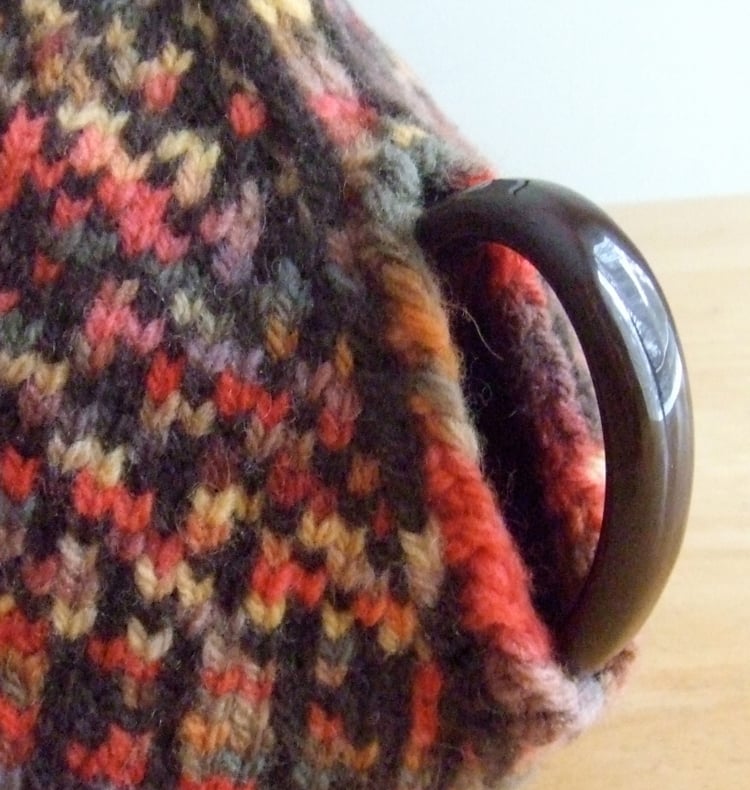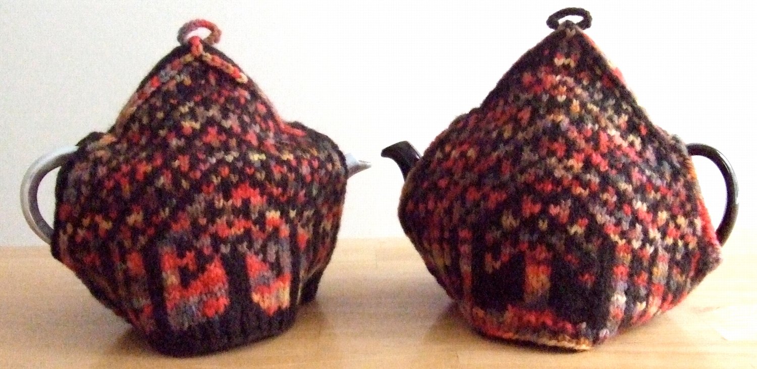 These tea cozies are knit in Kraemer Yarns Naturally Nazareth, a soft, domestically-produced, aran weight wool yarn of reasonable cost. One skein each of the two colors will make both tea cozies. The spouted samples are lightly fulled – see Finishing, in the pattern.