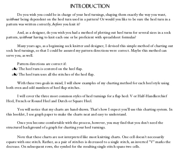 "Charting Your Way Through Heel Turns" is my 11-page booklet which diagrams exactly how I chart out ANY size V, French, or Dutch heel turn.