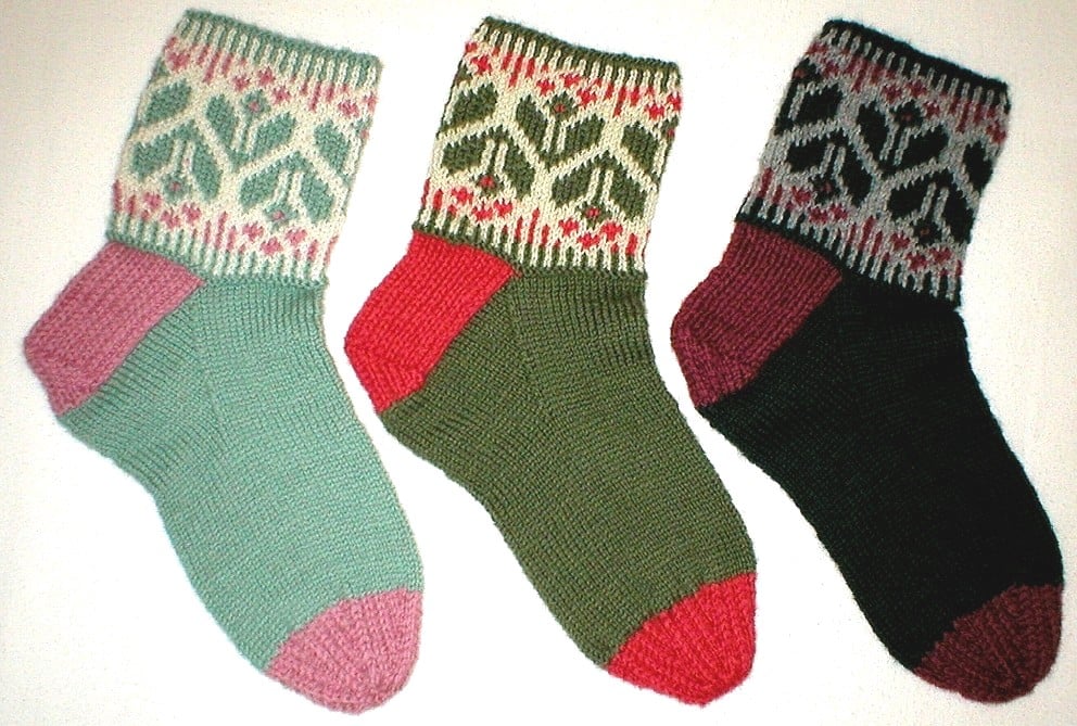 (Note: 2 skeins of MC, and 1 skein each of A and B will make 2 pair of socks.)