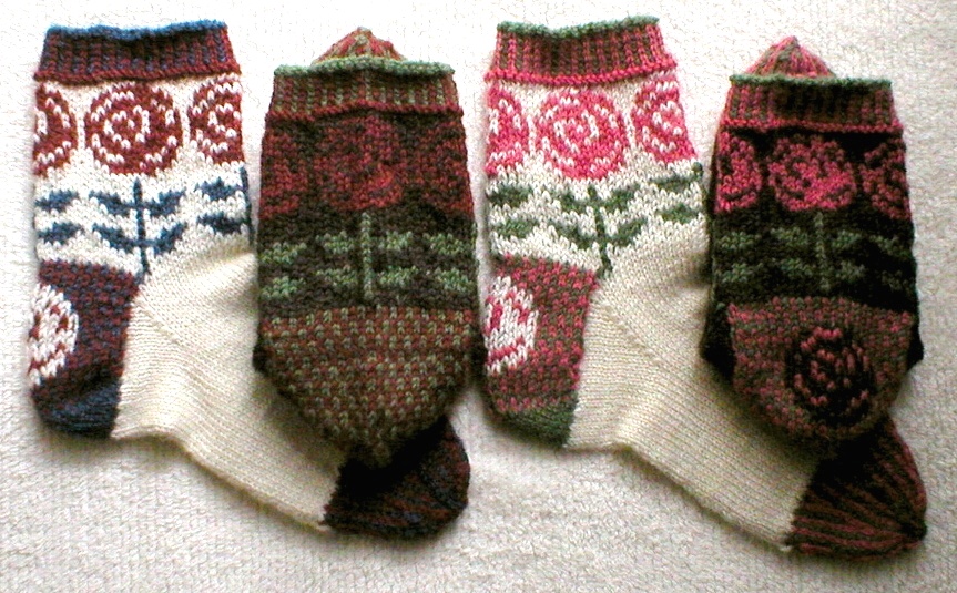 This heel motif may be knit in or duplicate stitched later, your choice. You may also leave the rose off the heel flap, as in the Winter Roses above.
