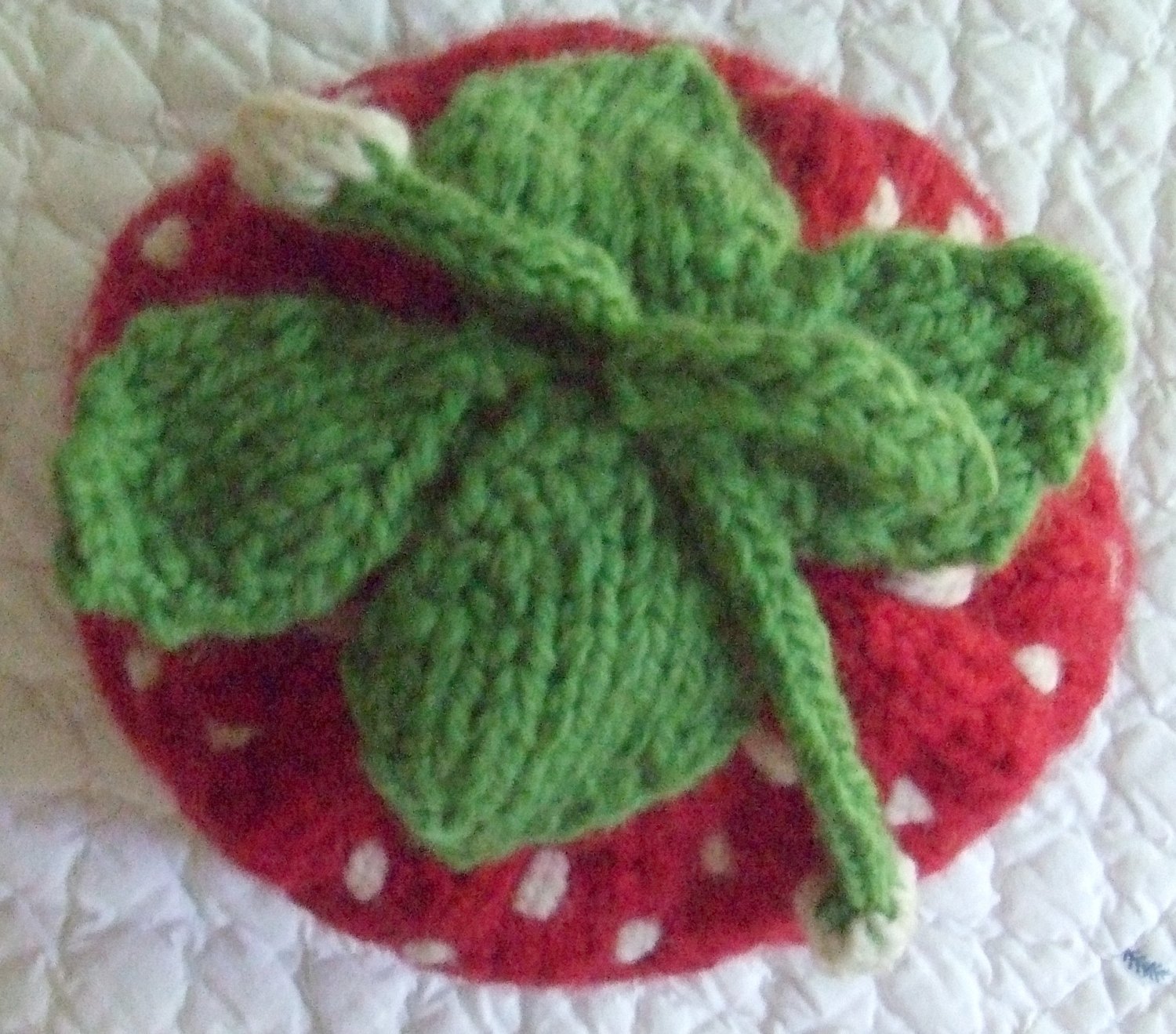 Four leaves, an I-Cord stem and I-Cord vines with newly forming white berries embellish the top. White seeds are stitched on after the knitting is complete.